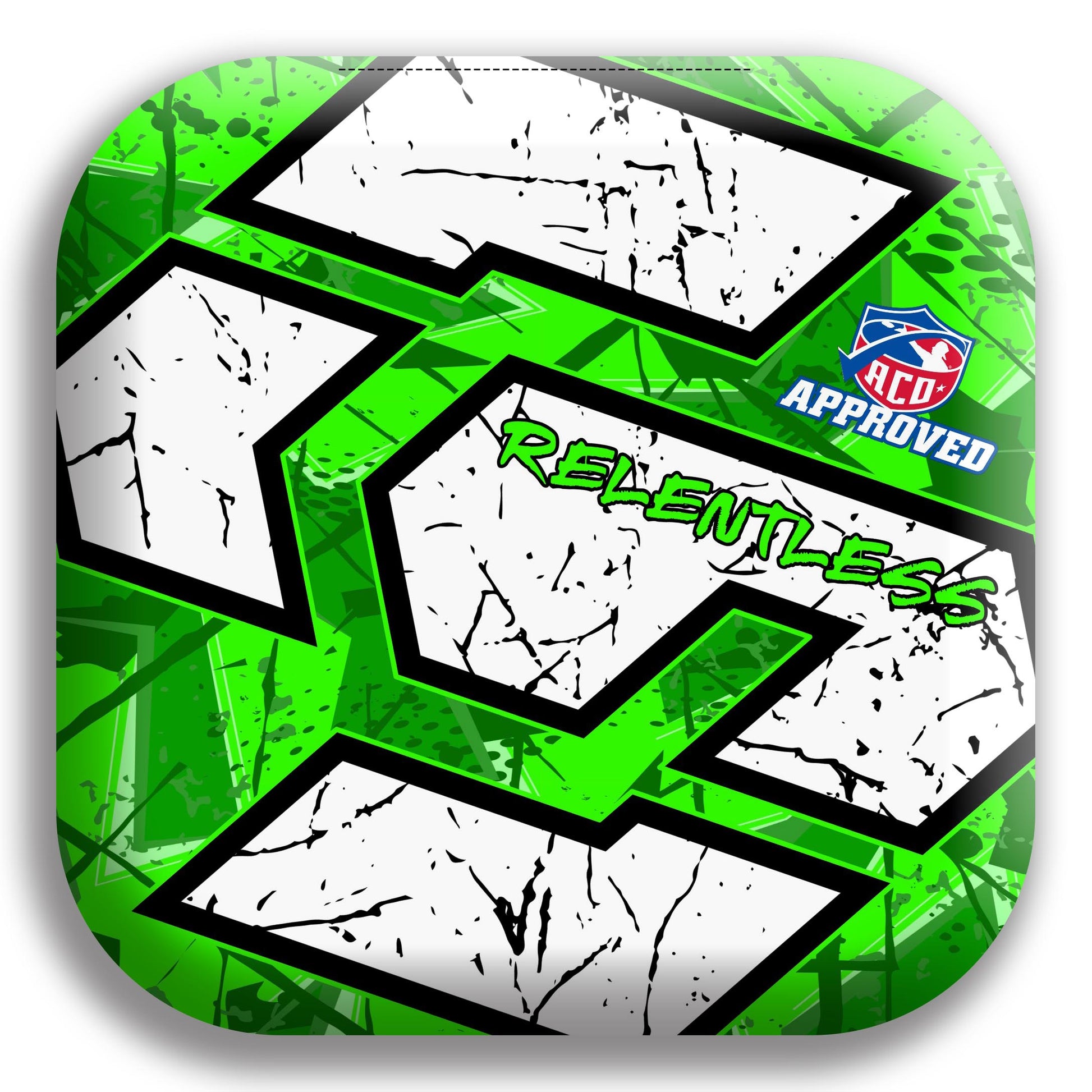 The slow side is a hybrid carpet material gaining popularity, and for good reason. Plays a little faster when new but once it's broken in, it really softens up to provide a ton of control and is very hole friendly. The fast side is a 9 speed that is very soft. Great for pushing, collecting bags, blowing through piles on the board, and plays well in all conditions. It's named relentless for a reason!